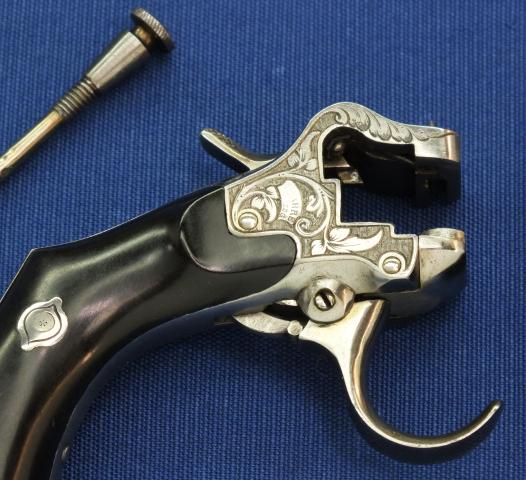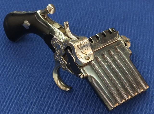 Een zeldzame gegraveerde Franse 6 schots double action Jarre Harmonica pinvuur pistool in kaliber 7mm. Lengte 15,5cm.