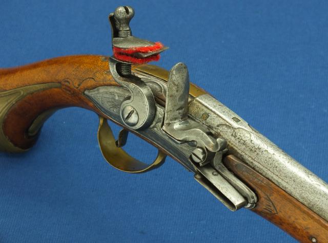 18e eeuws Nederlands vuursteen pistool van Oger Leblan Maastricht. Kaliber 15mm. 53cm lang. Loop met signatuur en 3 Maastricht keuren.